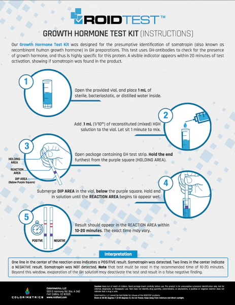 The Growth Hormone Test Kit utilizes GH antibodies to identify real growth hormone (somatropin) in GH products. It is incredibly accurate. This also means that it is not fooled by common GH-elevating peptides such as GHRP-2, GHRP-6, and Hexarelin, which are widely used to make GH counterfeits. These peptides are much cheaper than somatropin, but may still result in serum growth hormone elevations. They may be able to fool a blood test for growth hormone level, but not ROIDTEST™.